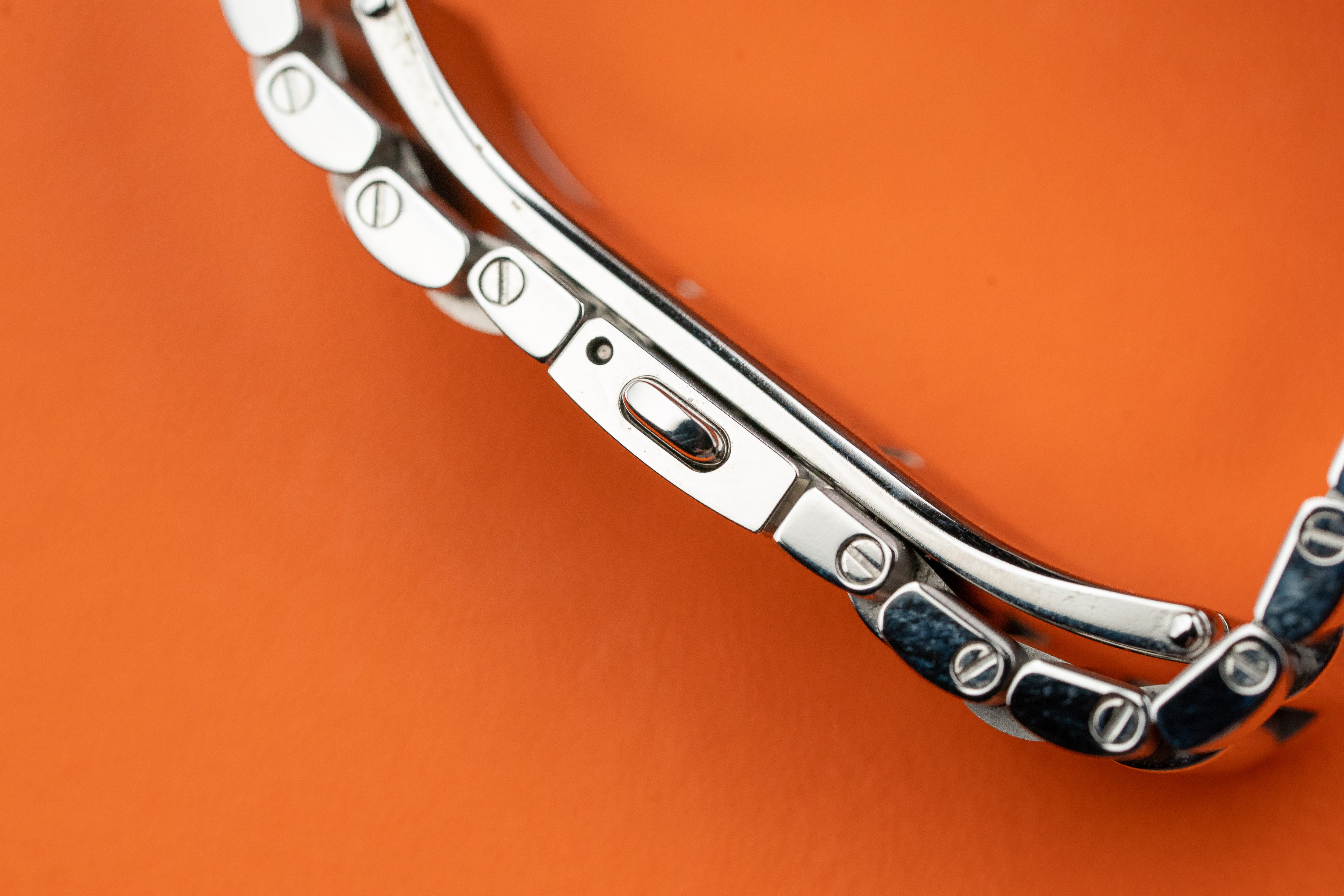 This 38 mm model, has a symmetrical case and crown in fully polished stainless steel and a wave-edged design featured on the back.