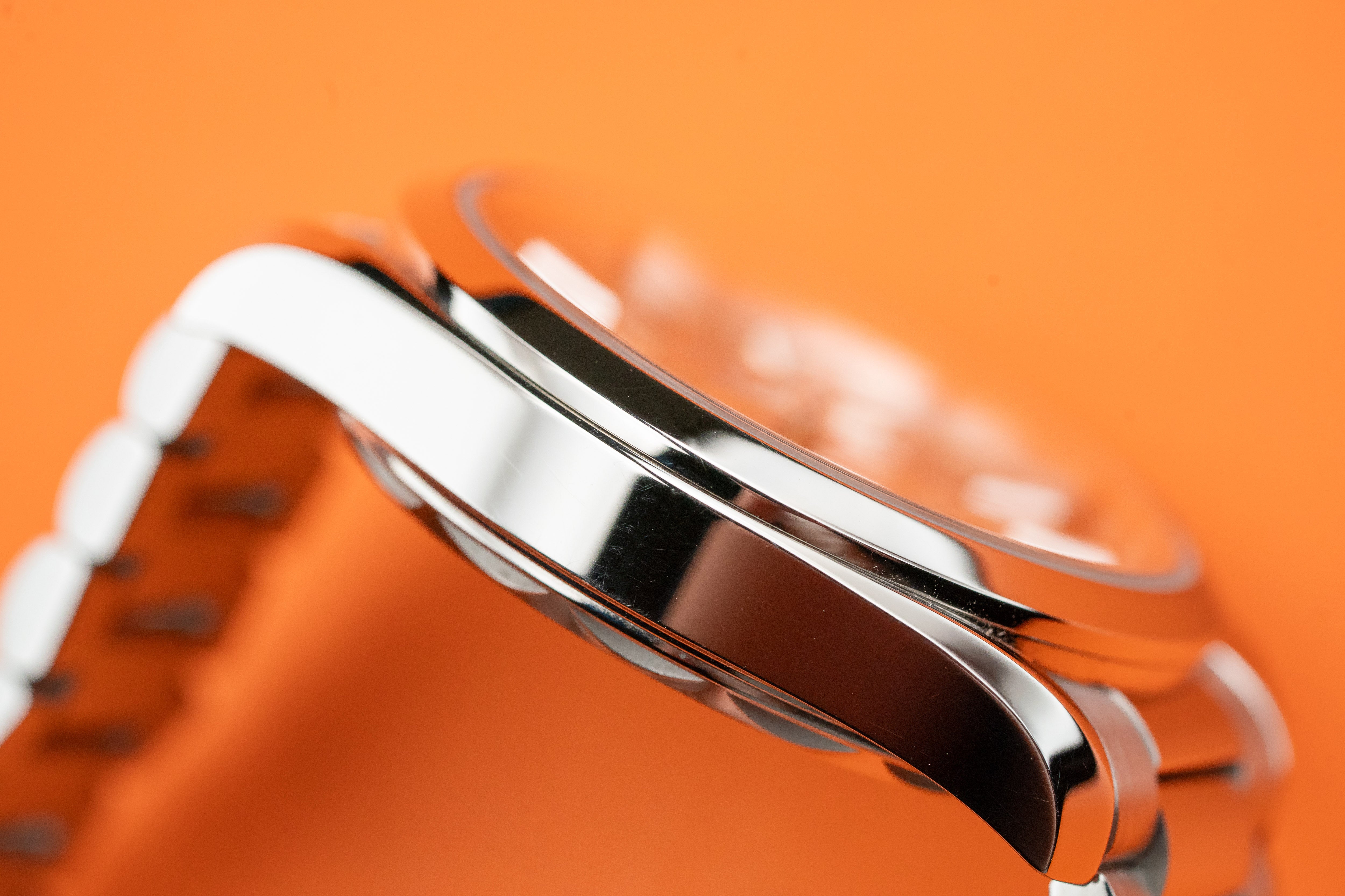 The saffron dial, fashioned from brass, is lacquered and sun-brushed from the centre. There is a date window at 6 o'clock and rhodium-plated hands and indexes filled with white Super-LumiNova.