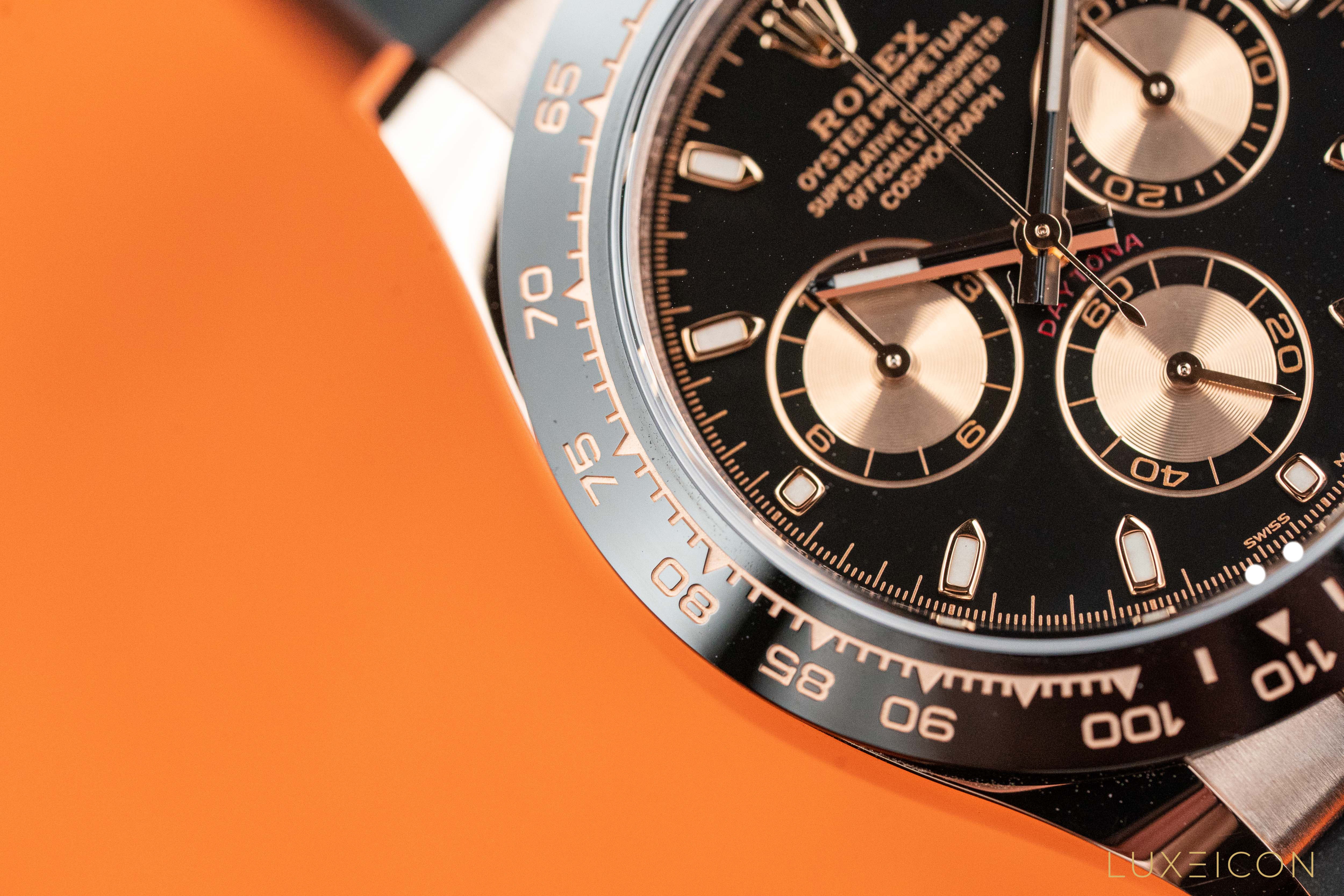 Rolex 116515LN Cosmograph Daytona, 18k Everose gold on an oysterflex black rubber strap with an 18k Everose gold deployant buckle, chronograph, cosc, rose dial with applied indexes, triploc winding crown, scratch proof cerachrom black bezel, small seconds at 9 o'clock, scrambled serial, diameter: 40mm, thickness: 12mm, sapphire crystal, water resistant.