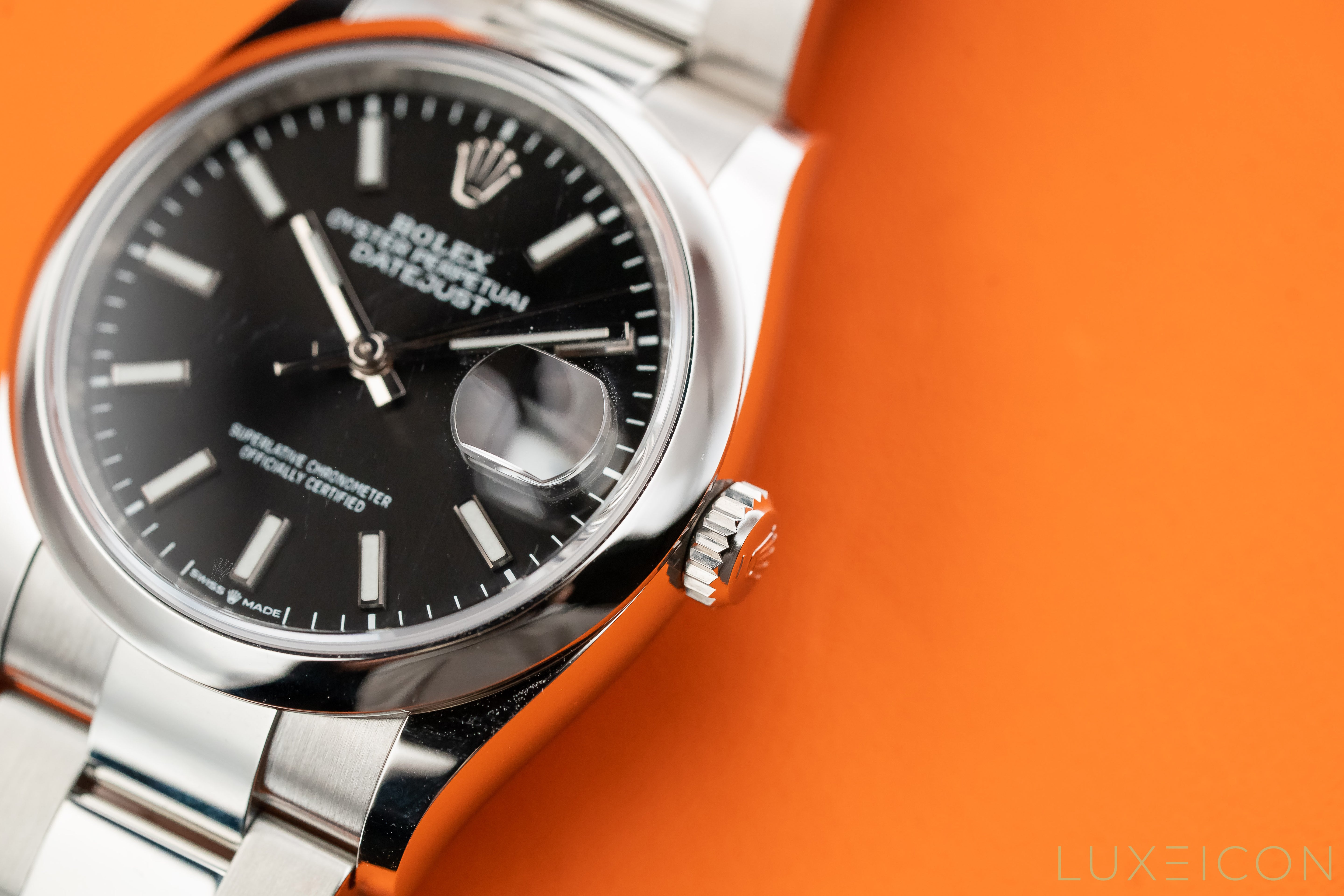 36mm Oystersteel case, screw-down steel back, screw-down crown with twinlock double waterproofness system, domed bezel, scratch-resistant sapphire crystal with cyclops lens over the date, black dial, index hour markers, Rolex calibre 3235 perpetual self-winding movement with center hour, minute and seconds hands, instantaneous date at 3 o'clock with rapid setting, and stop-seconds for precise time setting, approximately 70 hours of power reserve, Oyster bracelet with flat three-piece links, folding Oyster clasp buckle with Easylink 5mm comfort extension link. Waterproof to 100 meters.