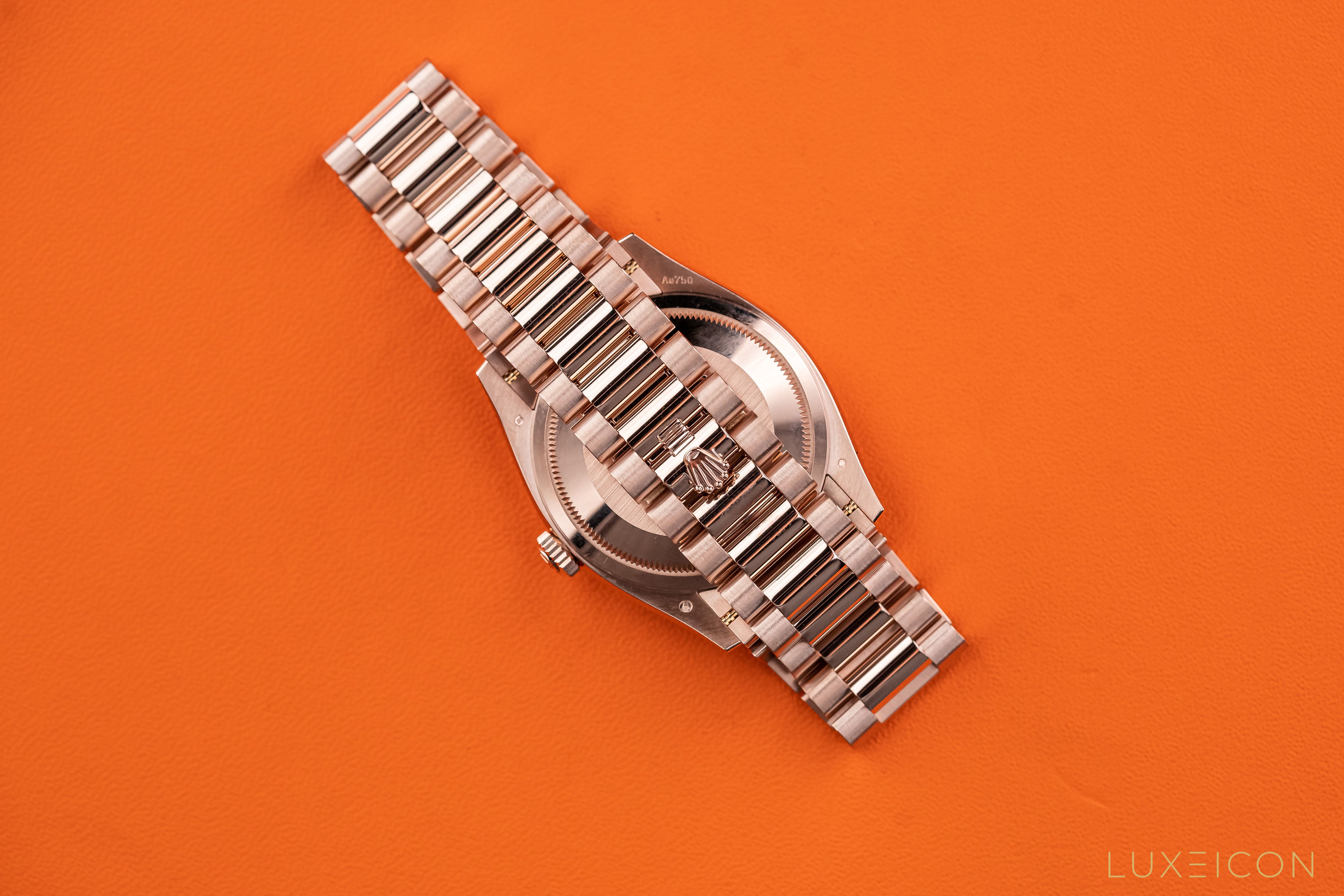 Rolex calibre 3255 perpetual self-winding movement with centre hour, minute and seconds hands, instantaneous day and date in apertures, unrestricted rapid-setting, and stop-seconds for precise time setting, approximately 70 hours of power reserve, 18K Everose gold President bracelet with semi-circular three-piece links, concealed folding Crownclasp buckle. Waterproof to 100 meters.