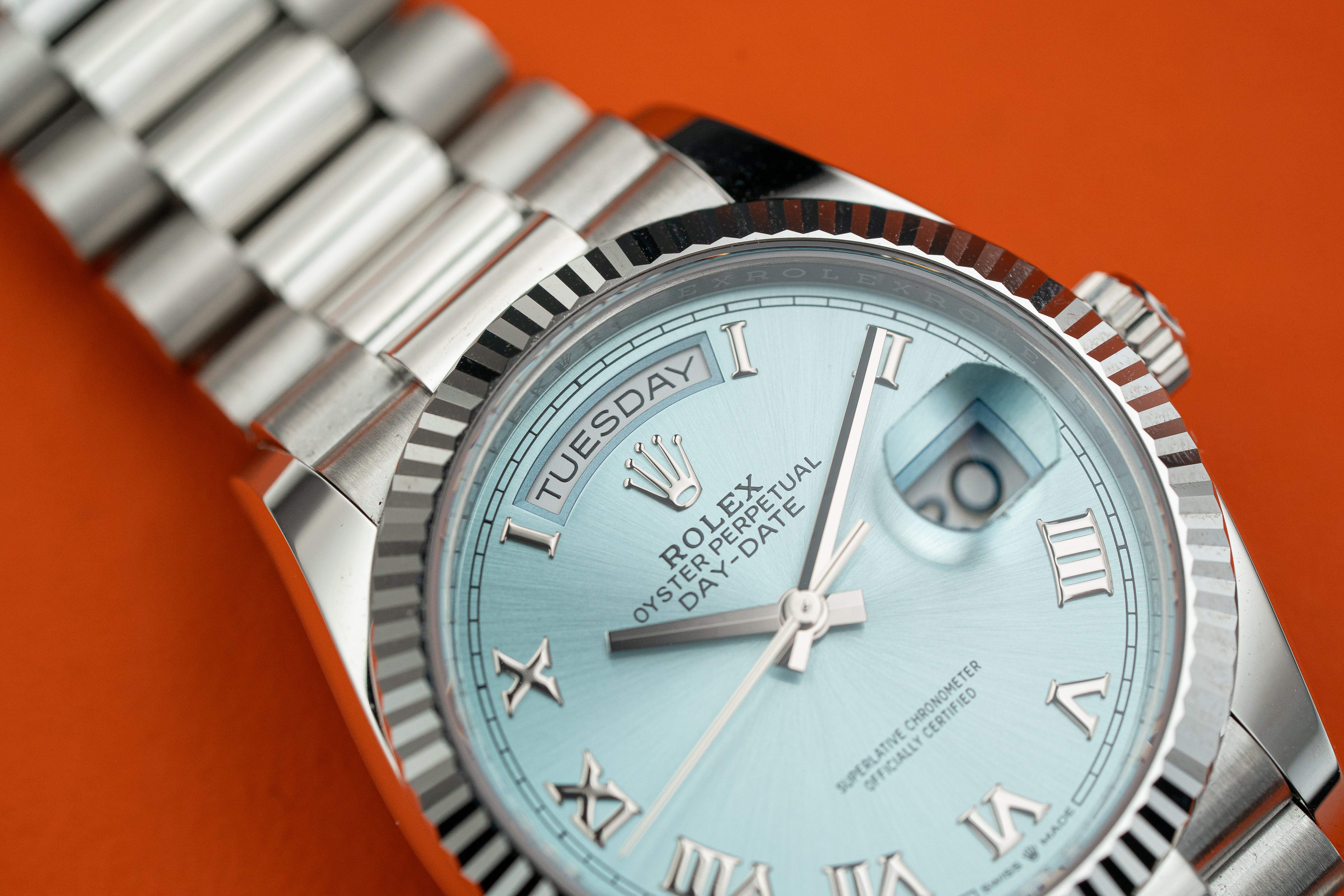 36mm platinum case, screw-down back, screw-down crown with twinlock double waterproofness system, fluted bezel, scratch-resistant sapphire crystal with cyclops lens over the date, ice blue dial, Roman numerals, Rolex calibre 3255 perpetual self-winding movement with centre hour, minute and seconds hands, instantaneous day and date in apertures, unrestricted rapid-setting, and stop-seconds for precise time setting, approximately 70 hours of power reserve, President bracelet with semi-circular three-piece links, concealed folding Crownclasp buckle. Waterproof to 100 metres / 330 feet.