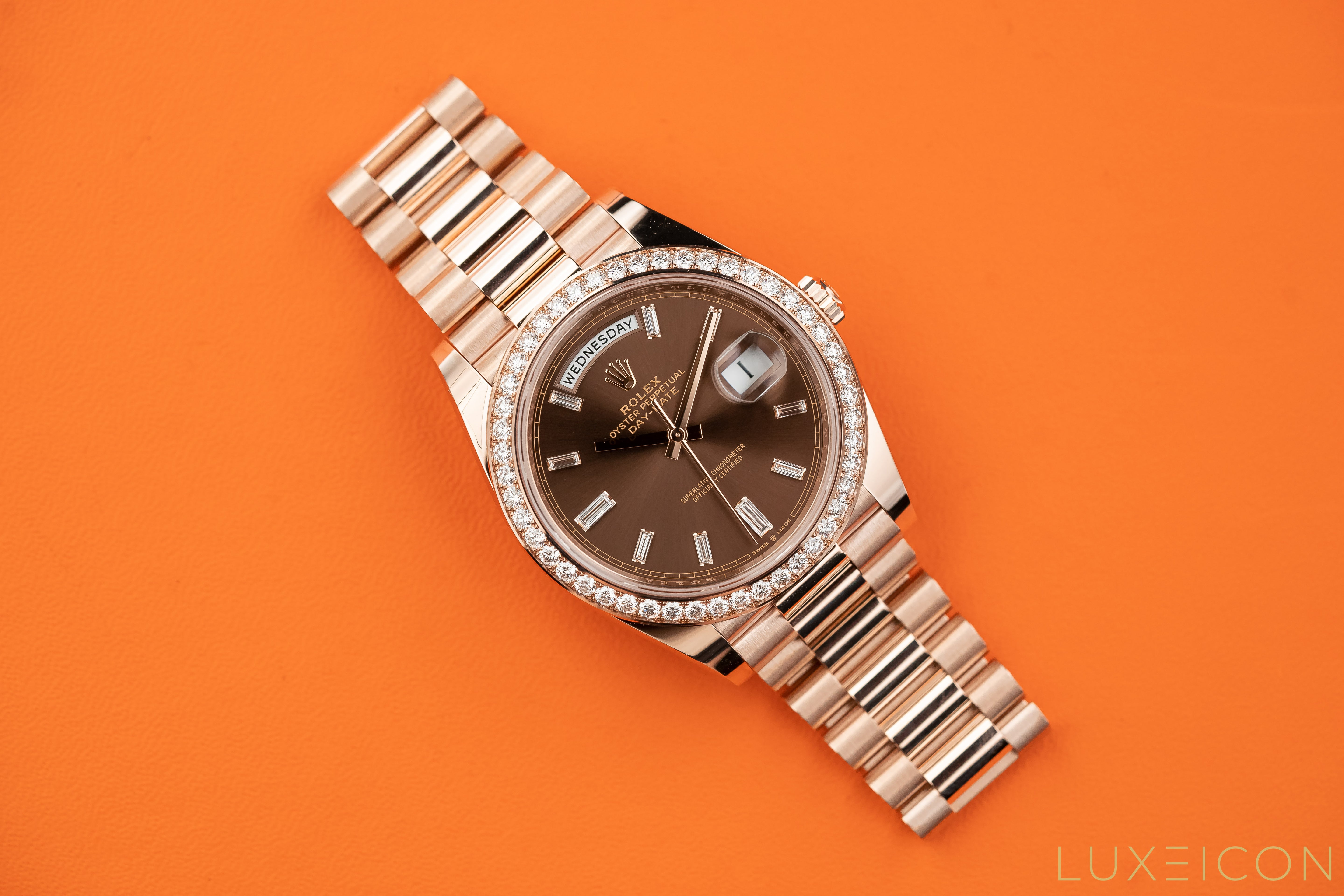 Rolex Day-Date President 40mm Chocolate Baguette Dial Diamond Bezel 228345RBR