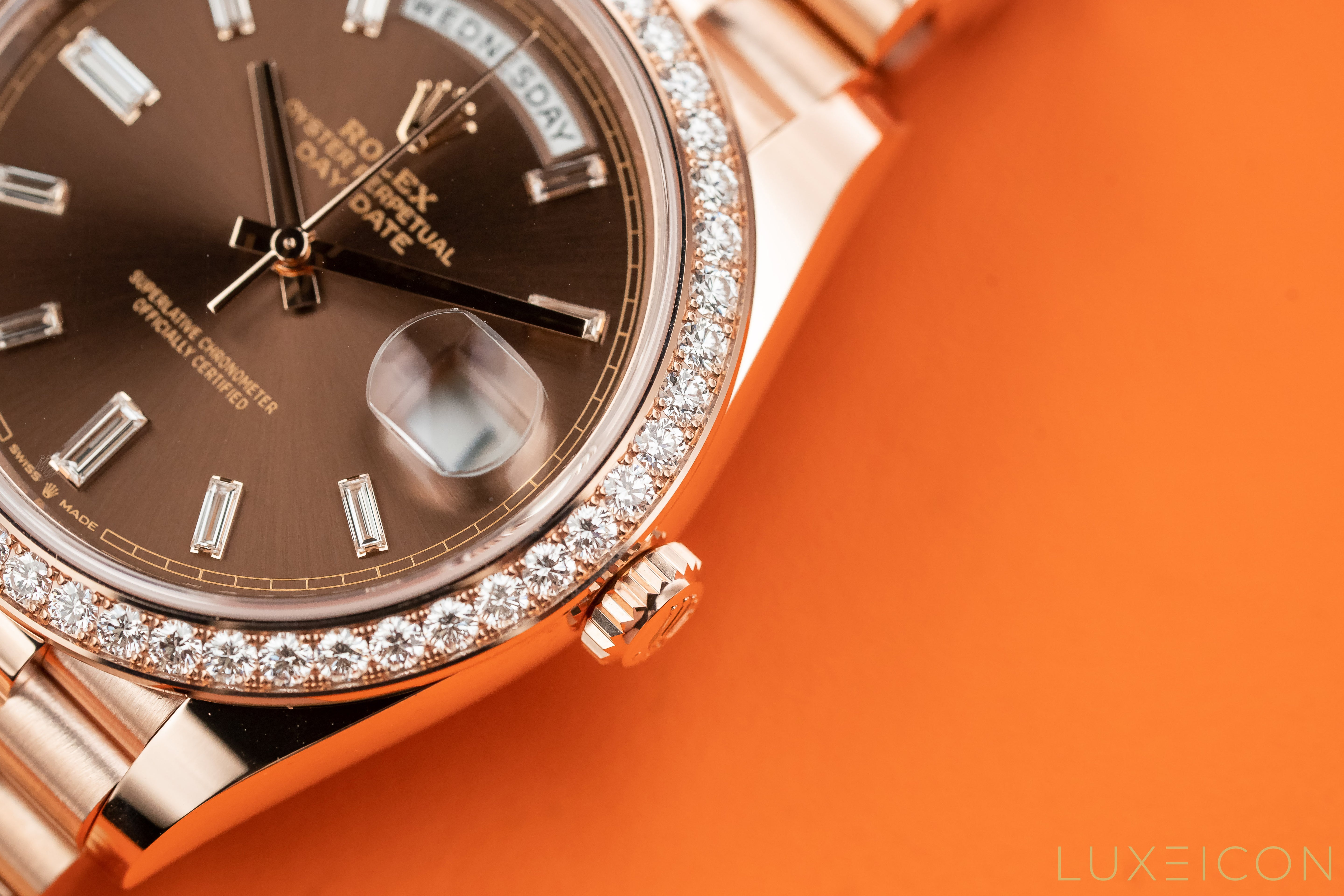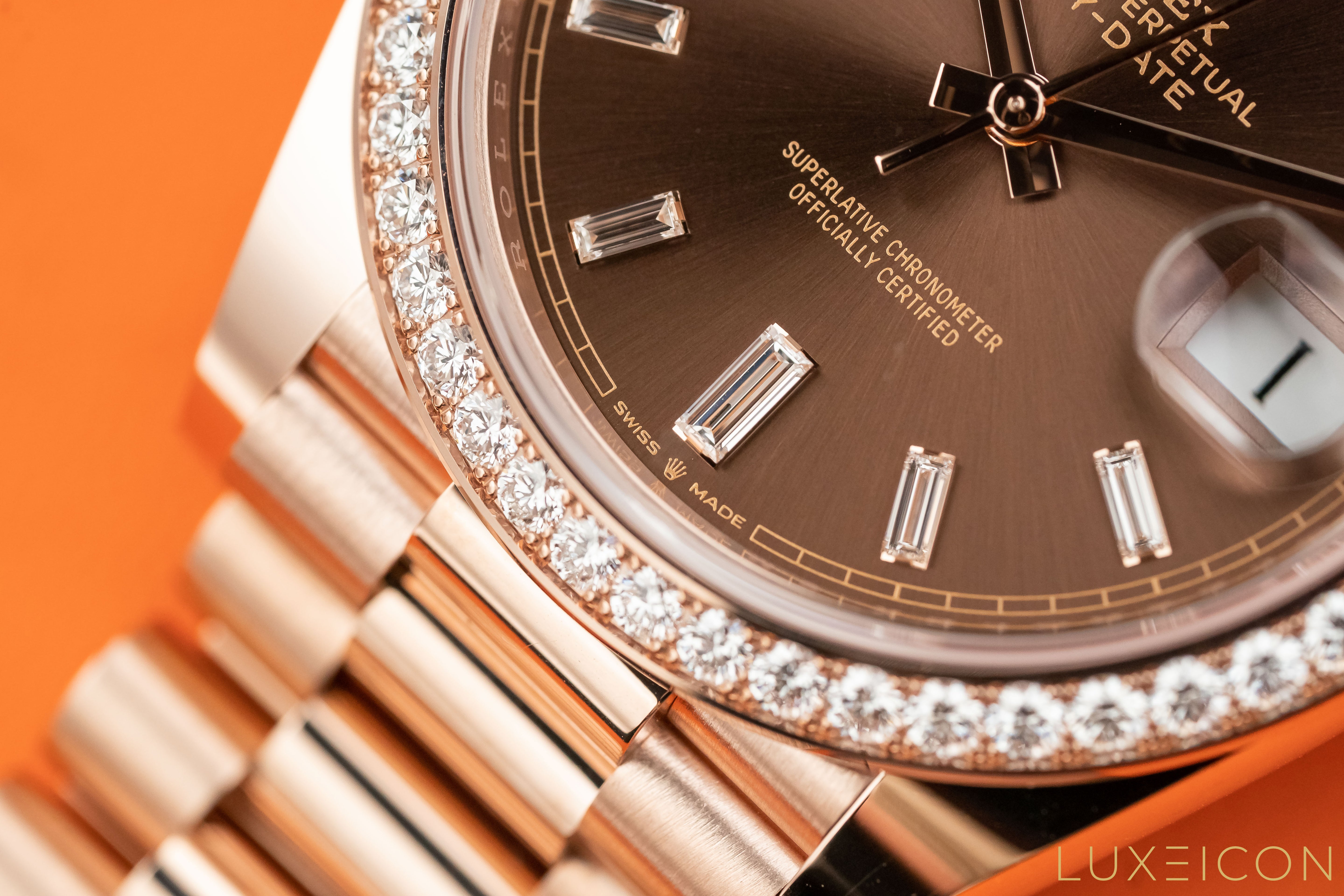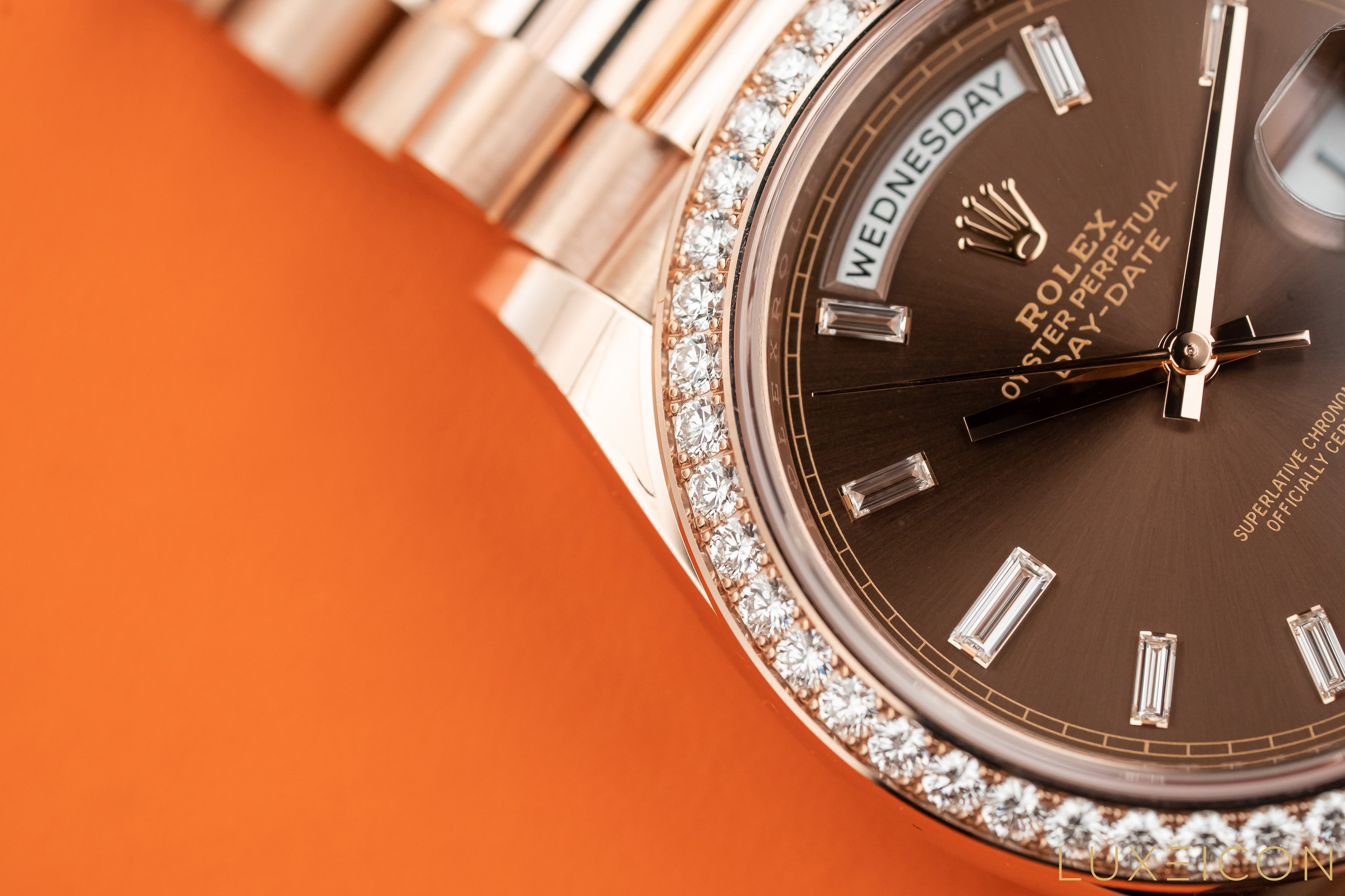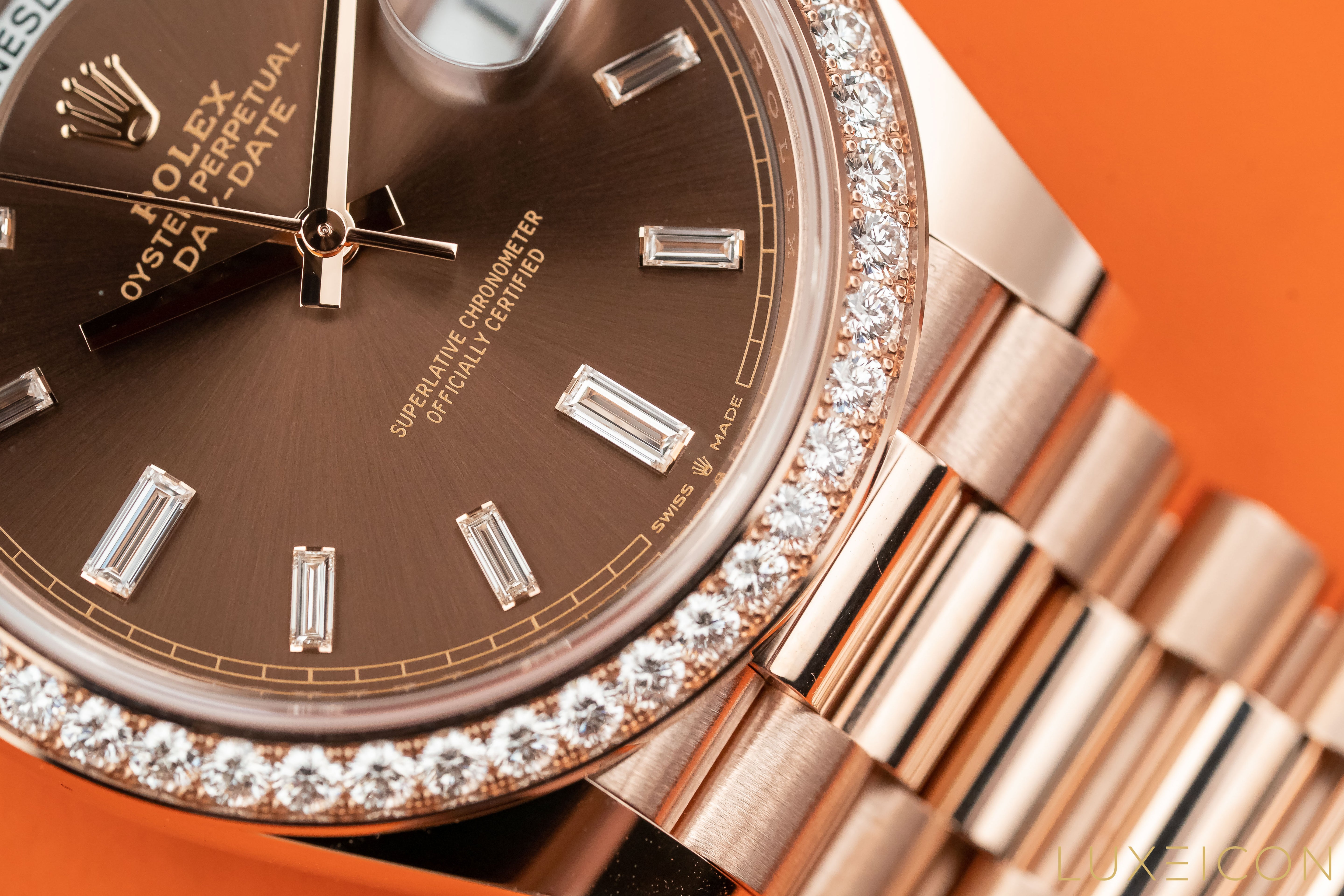 Rolex Day-Date President 40mm Chocolate Baguette Dial Diamond Bezel 228345RBR Unworn 2022