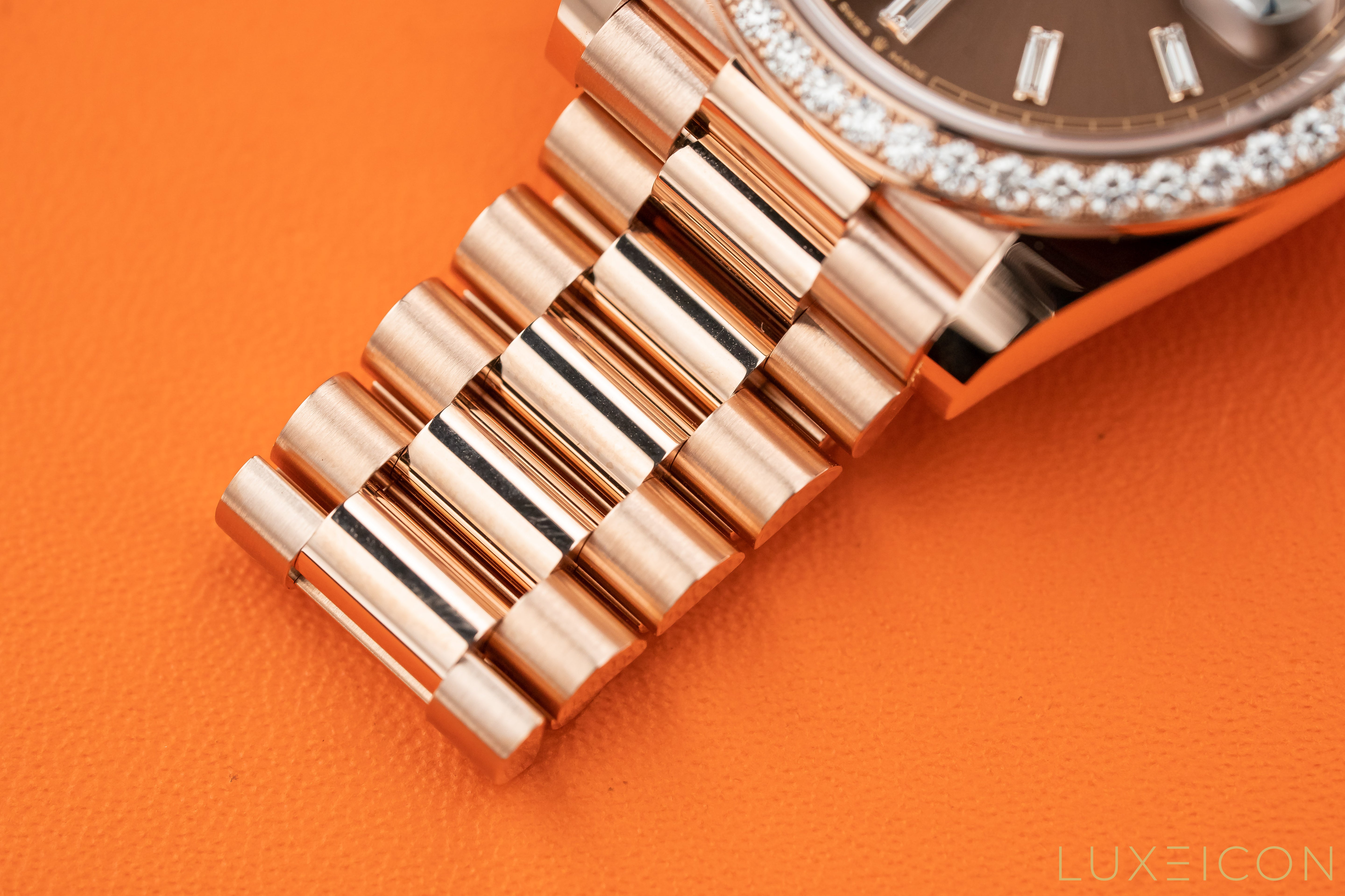 Bracelet: 18ct Everose gold President bracelet with hidden Crownclasp.