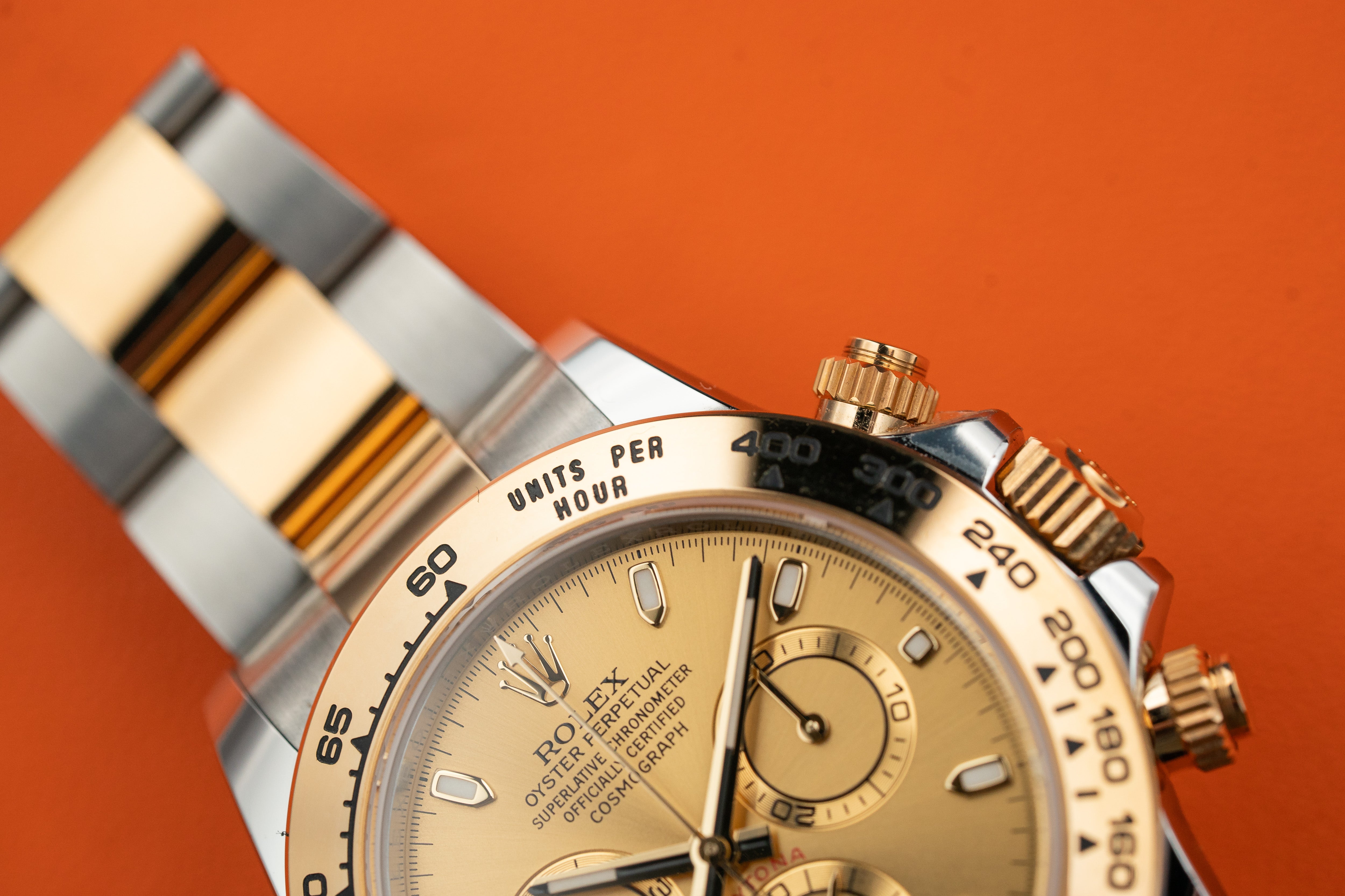 Silver-tone stainless steel case with a two-tone (silver-tone and gold-tone) stainless steel and 18kt yellow gold rolex oyster bracelet. Fixed tachymeter scale 18kt yellow gold bezel. Black dial with yellow gold-tone hands and luminous stick hour markers. Minute markers around the outer rim. Dial Type: Analog. Luminescent hands and dial markers. Chronograph - three sub-dials displaying: 60 second, 30 minute and 12 hour. Rolex Calibre 4130 Automatic movement, based upon Rolex 4030, containing 44 Jewels, bitting at 28800 vph, and has a power reserve of approximately 72 hours. Scratch resistant sapphire crystal. Screw down crown. Solid case back. Round case shape, case size: 40 mm. Oysterlock clasp. Water resistant at 100 meters / 330 feet.
