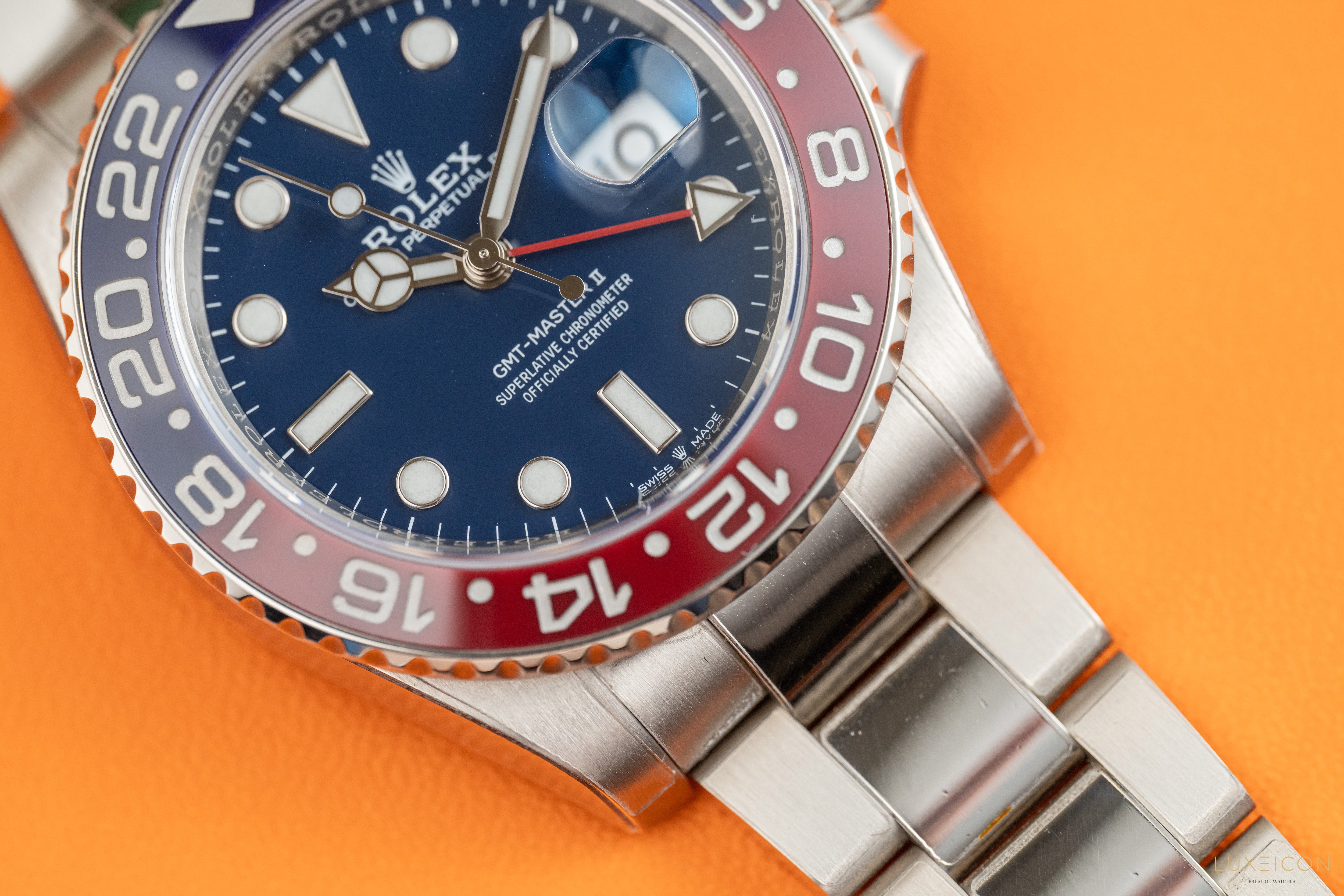 Bezel: Bidirectional red and blue ceramic bezel with 24-hour graduation. Inner engraved Rolex bezel ring