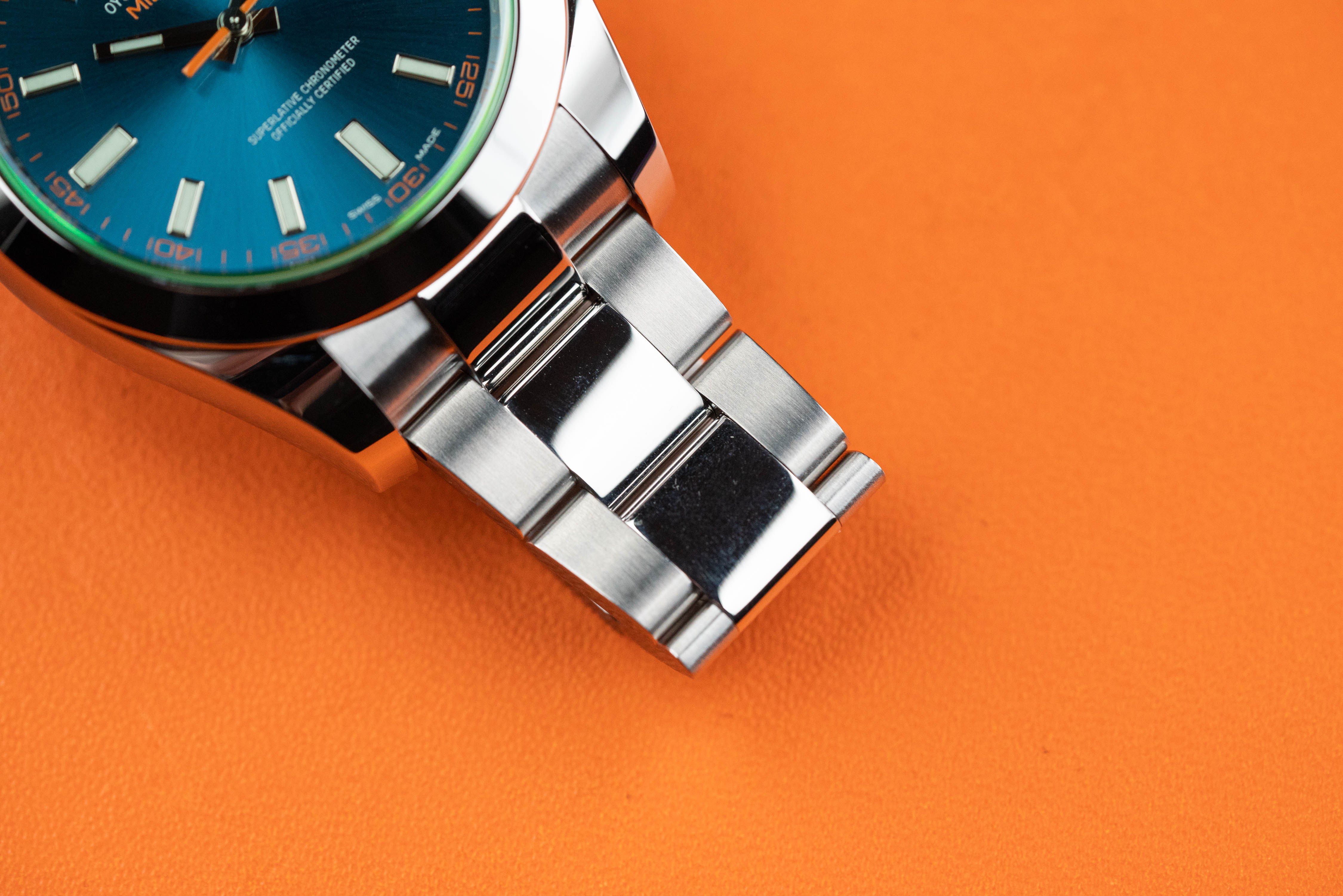 Rolex Milgauss casted in a Silver-tone stainless steel case with a silver-tone stainless steel Rolex oyster bracelet. Fixed domed silver-tone stainless steel bezel. Blue dial with Orange marked luminous hands and luminous stick hour markers. Minute markers around the outer rim. Dial Type: Analog. Luminescent hands and dial markers. Rolex Calibre 3131 automatic movement with a 48-hour power reserve. Scratch resistant green sapphire crystal crystal. Screw down crown. Solid case back. Round case shape, case size: 40 mm, case thickness: 12 mm. Band width: 19 mm. Deployment clasp. Water resistant at 100 meters / 330 feet. Functions: hour, minute, second, chronometer. Additional Info: orange lightning bolt second hand; resistant to magnetic flux density of 1,000 gauss
