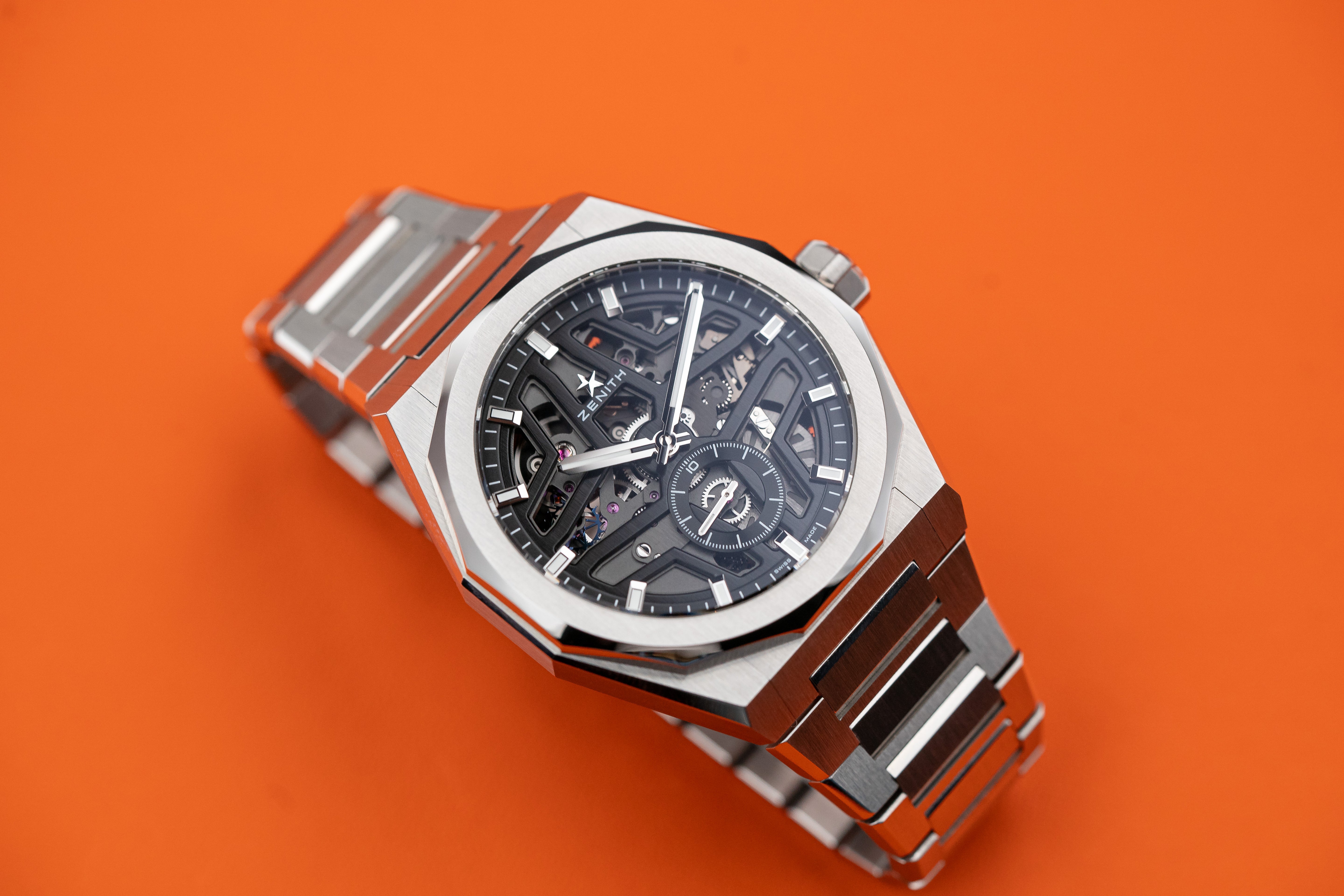 DEFY Skyline Skeleton in a 41mm steel octagonal case with a faceted bezel, featuring a black open dial revisiting the emblematic ZENITH four-pointed star. Powered by the El Primero 3620 SK high-frequency automatic manufacture skeleton movement with the very first 1/10th of a second indicator. Interchangeable steel bracelet and black patterned rubber strap.